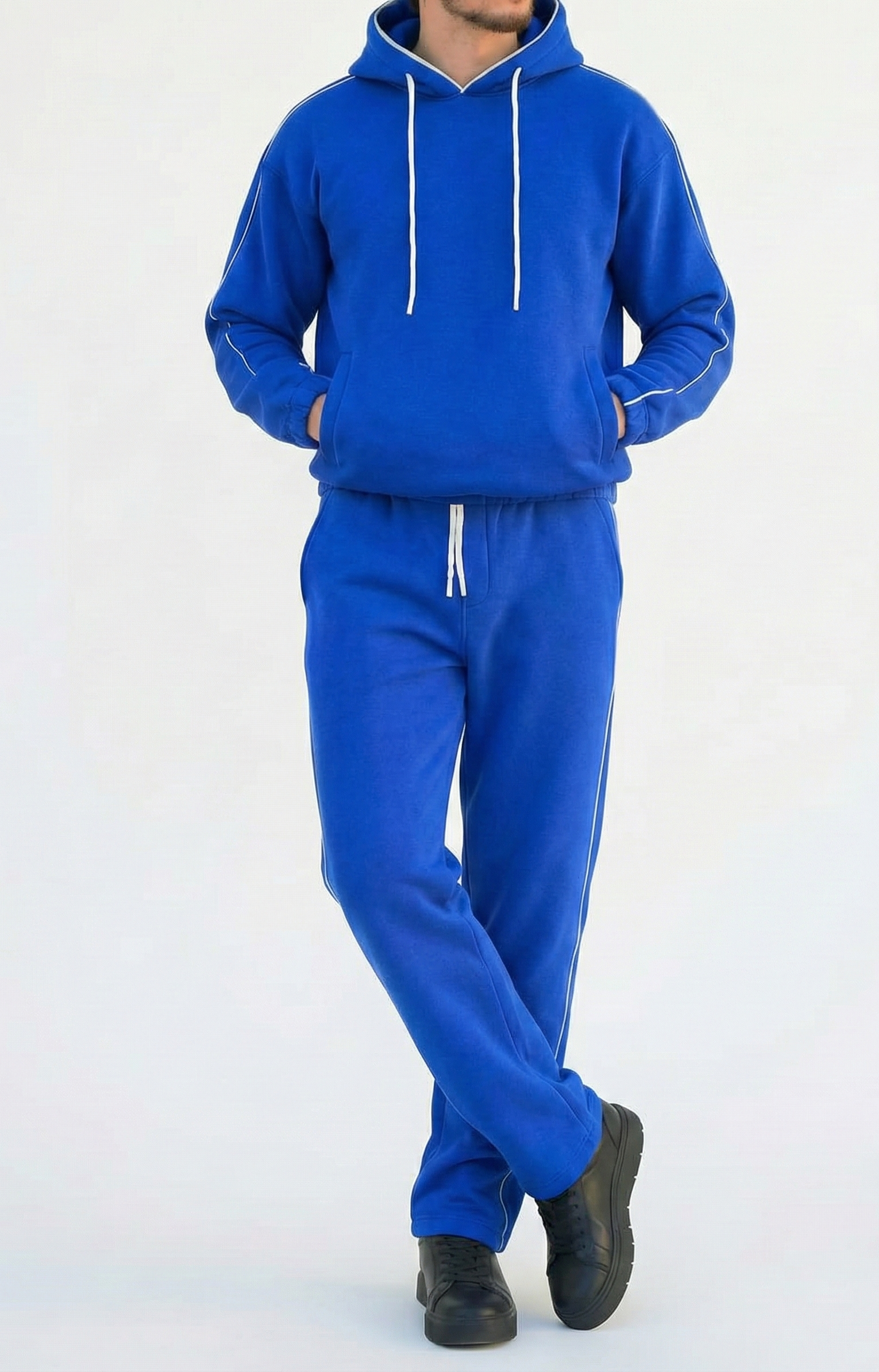Make a bold statement with this coordinated two piece set. We crafted this tracksuit for those who appreciate a sharp and sporty aesthetic without the hassle of matching separate pieces. The vibrant royal blue color grabs attention immediately while the crisp white piping details run along the sleeves and legs to create a streamlined athletic look. Perfect for gym sessions or relaxed weekends.
